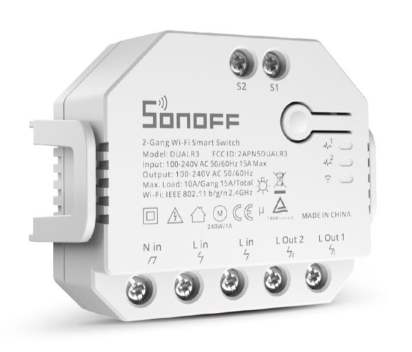 El Sonoff Dual R3 es un conmutador de 2 canales con WiFi con el que puede conectar y controlar dos dispositivos o luces de forma independiente. Esto significa que 1 Sonoff Dual es igual a 2 interruptores básicos de Sonoff.